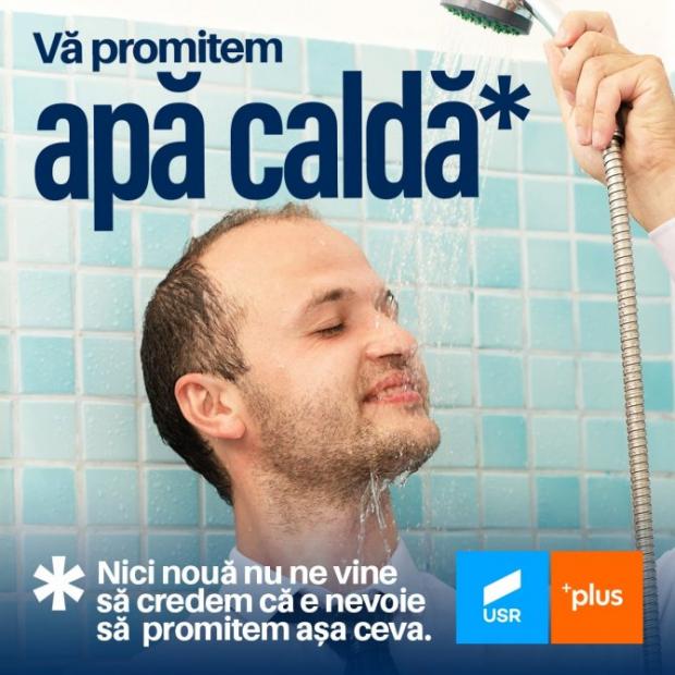 Desigur, dorința acestora este de apreciat. Nu și afișul însă. Potrivit acestuia, USR-iștii și cei de la PLUS fac duș... îmbrăcați în costum și cravată.