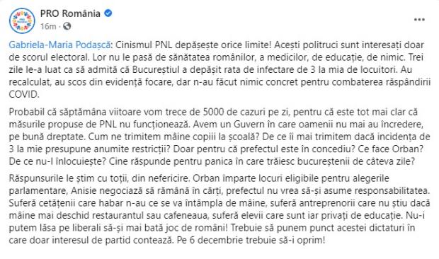 "Cinismul PNL depășește orice limite! Acești politruci sunt interesați doar de scorul electoral. Lor nu le pasă de sănătatea românilor, a medicilor, de educație, de nimic. Trei zile le-a luat ca să admită că Bucureștiul a depășit rata de infectare de 3 la mia de locuitori. Au recalculat, au scos din evidență focare, dar n-au făcut nimic concret pentru combaterea răspândirii COVID.