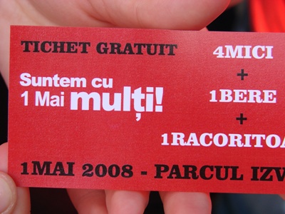 Mai întâi, însă, cei prezenţi s-au bătut pentru tichetele gratuite, cu care îţi puteai ?achiziţiona? 4 mici, o bere şi o răcoritoare de la standurile special amenajate în Parcul Izvor. Oricum, tichetele îţi erau oferite doar dacă erai o ?faţă cunoscută? în organizaţiile locale. Altfel, erai privit cu suspiciune şi majoritatea celor prezenţi îţi întorceau spatele. Cu greu puteai obţine măcar un tricou PSD - inscripţionat fie cu sigla partidului, fie cu sloganul ?Suntem cu 1 mai mulţi!?.