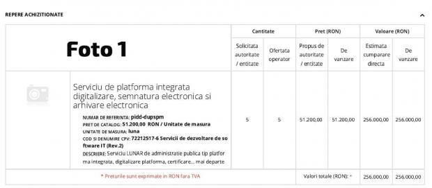 Clotilde Armand cumpără prin achiziție directă un abonament lunar de management al documentelor și semnătură electronică în valoare totală de peste 250.000 de lei.