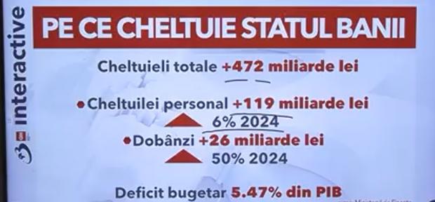 Dacă statul a încasat, în 2025, mai mulţi bani de pe urma acestor creşteri de taxe, a avut şi cheltuieli mai mari, în total de peste 472 de miliarde de lei, din care au însemnat: