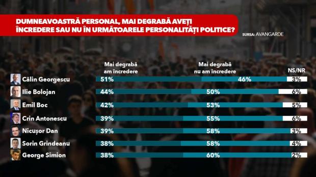 Abia apoi urmează candidatul coaliției la alegerile prezidențiale din 2025, Crin Antonescu, cu 39% rată de încredere. La egalitate este și Nicușor Dan, care, însă, are o rată puțin mai mare de neîncredere (58%, în comparație cu 55% Antonescu).