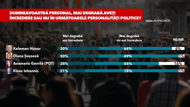 La coada clasamentului, după președinta POT, Anamaria Gavrilă (28% încredere) se află Klaus Iohannis. În cazul lui, rezultatele arată în felul următor: doar 21% au spus că au încredere în actualul președinte, în timp ce 78% au afirmat că mai degrabă nu au încredere în el.