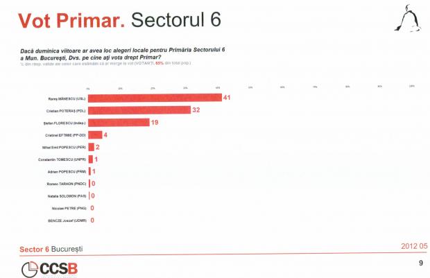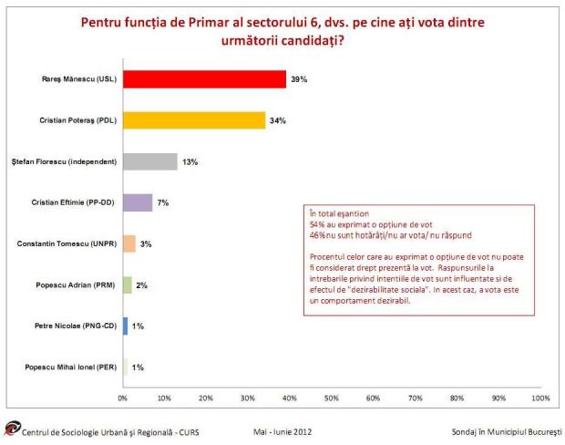 Astfel, potrivit celei mai recente cercetări CURS, realizată la comanda GeoPol în perioada 27 mai-2 iunie 2012, candidatul USL la Primăria Sectorului 6 era cotat cu 39%, în urcare faţă de sondajele anterioare, înaintea lui Cristian Poteraș, cotat la 34%. În cel de-al doilea sondaj, realizat de CCSB în perioadă 28-30 mai, lucrurile stau și mai bine pentru candidatul USL: Mănescu are un avans mai mare, fiind cotat cu 41%, în timp ce actualul primar are doar 32%.