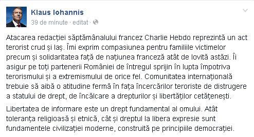 "Atacarea redacţiei săptămânalului francez Charlie Hebdo reprezintă un act terorist crud şi laş. Îmi exprim compasiunea pentru familiile victimelor precum şi solidaritatea faţă de naţiunea franceză atât de lovită astăzi. Îi asigur pe toţi partenerii României de întregul sprijin în lupta împotriva terorismului şi a extremismului de orice fel. Comunitatea internaţională trebuie să aibă o atitudine fermă în faţa încercărilor teroriste de distrugere a statului de drept, de încălcare a drepturilor şi libertăţilor cetăţeneşti", a scris preşedintele, miercuri, pe contul său de Facebook.