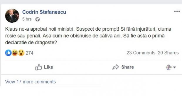 "Klaus ne-a aprobat noii ministri. Suspect de prompt! Si fārā injurāturi, ciuma rosie sau penali. Asa cum ne obisnuise de câtiva ani. Sā fie asta o primā declaratie de dragoste?", a scris Codrin Ștefănescu.