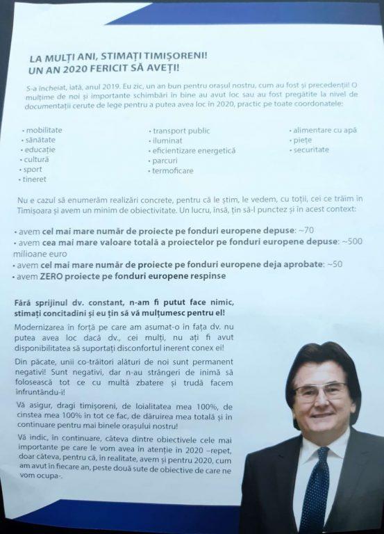 În materialul trimis timișorenilor, după ce se laudă cu numărul de proiecte depuse, Nicolae Robu a lansat un nou atac la cei care nu-i ridică osanale. ”Din păcate, unii co-trăitori alături de noi sunt permanent negativi! Sunt negativi, dar nu au strângeri de inimă să folosească tot ce cu multă zbatere și trudă facem înfruntându-i! Vă asigur, dragi timișoreni, de loialitatea mea 100%, de cinstea mea 100% în tot ce fac, în dăruirea mea totală și în continuare pentru mai binele orașului nostru!”,  a scris primarul.