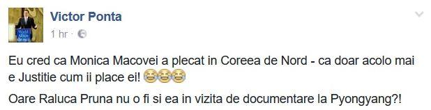 “Eu cred ca Monica Macovei a plecat in Coreea de Nord - ca doar acolo mai e Justitie cum ii place ei! Oare Raluca Pruna nu o fi si ea in vizita de documentare la Pyongyang?!”