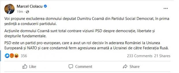 "Voi propune excluderea domnului deputat Dumitru Coarnă din Partidul Social Democrat, în prima ședință a conducerii partidului.