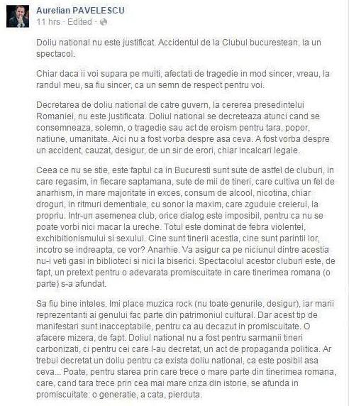 „Chiar dacă îi voi supără pe mulţi, afectaţi de tragedie în mod sincer, vreau, la rândul meu, să fiu sincer, că un semn de respect pentru voi. Decretarea de doliu naţional de către guvern, la cererea preşedintelui României, nu este justificată. Doliul naţional se decretează atunci când se consemnează, solemn, o tragedie sau act de eroism pentru ţara, popor, naţiune, umanitate. Aici nu a fost vorba despre aşa ceva. A fost vorba despre un accident, cauzat, desigur, de un şir de erori, chiar încălcări legale“.