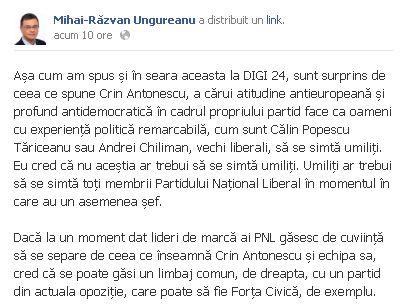 Dacă la un moment dat, lideri de marcă ai PNL găsesc de cuviinţă să se separe de ceea ce înseamnă Crin Antonescu şi echipa sa, cred că se poate găsi un limbaj comun, de dreapta, cu un partid din actuala opoziţie, care poate să fie Forţa Civică, de exemplu", a scris MRU pe contul său de Facebook.