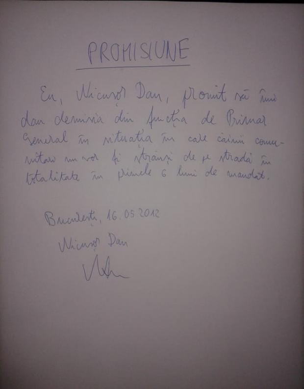 "Eu, Nicuşor Dan, promit să îmi dau demisia din funcţia de Primar General în situaţia în care câinii comunitari nu vor fi strânşi de pe stradă în totalitate în primele şase luni de mandat. Bucureşti, 16.05.2012", a scris atunci Nicuşor Dan.