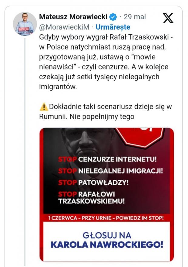 "Dacă Rafał Trzaskowski ar câștiga alegerile, în Polonia ar începe imediat munca la legea deja pregătită privind «discursul instigator la ură» - adică cenzura. Și sunt sute de mii de imigranți ilegali care așteaptă la coadă. Acesta este exact scenariul care se întâmplă în România. Să nu facem această greșeală în Polonia", a scris fostul premier polonez pe contul său oficial de pe platforma X.