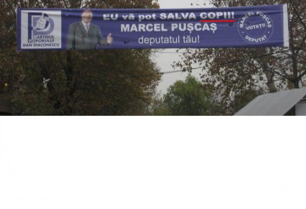 Cocoţat pe un banner, Marcel Puşcaş spune că ne poate "salva copii", şi nu "copiii", aşa cum este corect. "Eu vă pot salva copii" Marcel Puşcaş, deputatul tău!".