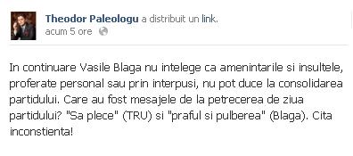 "În continuare Vasile Blaga nu înţelege că ameninţările şi insultele, proferate personal sau prin interpuşi, nu pot duce la consolidarea partidului. Care au fost mesajele de la petrecerea de ziua partidului? Să plece? (TRU) şi ?praful şi pulberea? (Blaga). Câtă inconştienţă!", a comentat Paleologu pe Facebook.