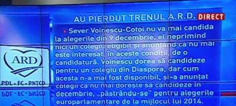 Voinescu dorea să candideze pentru un colegiu din Diaspora, dar cum acesta n-a mai fost disponibil, şi-a anunţat colegii că nu mai vrea să candideze la alegerile din iarnă, „păstrându-se" pentru alegerile europarlamentare de la mijlocul lui 2014.