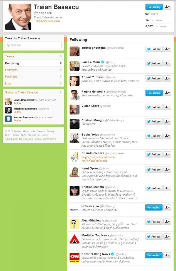 Suprinzător, în coada listei apare şi CNN, la care este afiliată Antena 3, dar la fel de surprinzător este şi că Traian Băsescu nu urmăreşte postările fiicei sale, Elena.