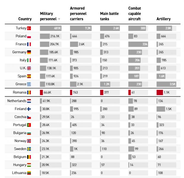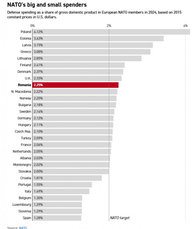 În prezent, Bucureştiul cheltuieşte 2,25% din PIB pentru apărare, peste obiectivul de 2% al alianţei, şi îşi propune să crească cheltuielile militare la 2,5% anul viitor şi la 3% în 2026. Scopul este de a-şi moderniza arsenalul şi de a înlocui echipamentele vechi din era sovietică.