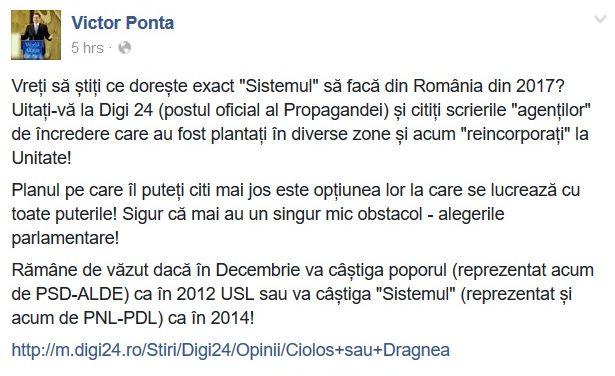 "Vreți să știți ce dorește exact "Sistemul" să facă din România din 2017? Uitați-vă la Digi 24 (postul oficial al Propagandei) și citiți scrierile "agenților" de încredere care au fost plantați în diverse zone și acum "reincorporați" la Unitate!