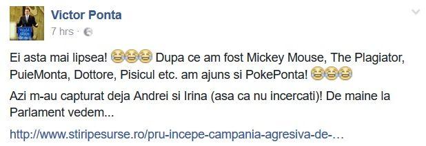 Fostul premier, Victor Ponta, a avut, duminică, o reacție, pe pagina de Facebook, după ce PRU a lansat Operațiunea ”Dă-i lui PokePonta un mesaj pe FB să vină la PRU!!!”. Campania a fost demarată de deputatul Bogdan Diaconu, președintele PRU pe pagina sa personală de Facebook.