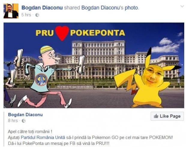 Partidul România Unită a lansat Operațiunea ”Dă-i lui PokePonta un mesaj pe FB să vină la PRU!!!”. Campania a fost demarată de deputatul Bogdan Diaconu, președintele PRU pe pagina sa personală de Facebook:
