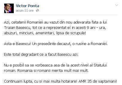 "Azi, cetăţenii României au văzut din nou adevărata faţă a lui Traian Băsescu, tot ce a reprezentat el în aceşti 9 ani - ură, abuzuri, minciuni, ameninţări, lipsă de scrupule! Ăsta e Băsescu! Un preşedinte decăzut, o ruşine a României. Este total degradant ce a făcut Băsescu azi. Nu e posibil să se vorbească aşa de la acest nivel al Statului român. România şi românii merită mult mai mult", se arată în mesajul postat pe contul de Facebook al lui Victor Ponta.