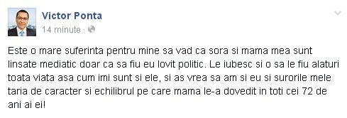 "Este o mare suferinţă pentru mine să văd că sora şi mama mea sunt linşate mediatic doar ca să fiu eu lovit politic. Le iubesc şi o să le fiu alături toată viaţa aşa cum îmi sunt şi ele, şi aş vrea să am şi eu şi surorile mele tăria de caracter şi echilibrul pe care mama le-a dovedit în toţi cei 72 de ani ai ei!", a scris premierul Victor Ponta pe Facebook.