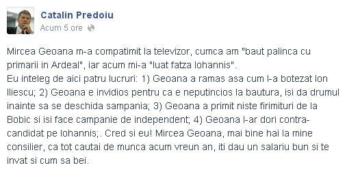 Într-o postare pe Facebook, Predoiu spune despre Geoană că nu ţine la băutură şi că-l poate angaja pe post de consilier. Mai mult decât atât, prim-vicepreşedintele PDL adaugă că este dispus să îi dea lecţii la băutură.