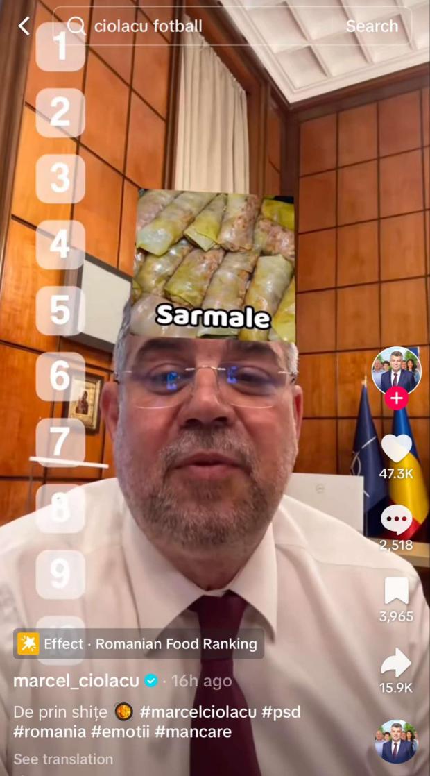 Cea mai recentă postare a prim-ministrului în funcție pe rețeaua chineză TikTok este făcută din biroul de la Palatul Victoria și are legătură nu cu activitatea guvernamentală ci cu preferințele culinare ale liderului PSD. Ciolacu face un top al mâncărurilor pe care le preferă. Pe primul loc pune mămăliga, despre care spune că este „mâncarea tradițională a românului. Topul este completat de ciorba de burtă, sarmale, și mici. Postarea este însoțită de câteva haștaguri, printre care #emoții și #mâncare.