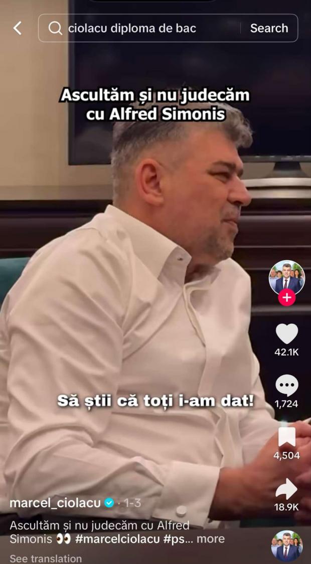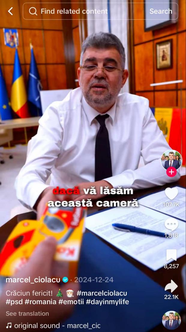 Premierul României și președintele PSD, Marcel Ciolacu, și-a mutat activitatea online pe TikTok. Rețeaua chineză care a influențat alegerile prezidențiale din România a devenit aproape o obsesie pentru prim-ministrul României, care își filmează aproape zilnic și își postează activitatea de la Palatul Victoria și răspunde la provocări care mai de care mai bizare din biroul de la Guvern.