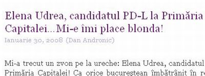 P.S. 1 - Primele reacţii la intenţia Elenei Udrea de a candida la primăria Capitalei au apărut deja pe bloguri. Mai exact, pe danandronic.ro. Fostul consilier politic PSD, actual consilier politic PNL, se declară pregătit gramatical să o susţină pe blonda de la drept la primărie. Cu un titlu demn de Finkelstein si Silberstein, Dan Andronic e bărbat şi declară sec: "Mi-e îmi place blonda!" (vezi foto).