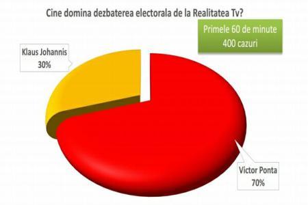 70% dintre persoanele chestionate care au urmărit emisiunea de la Realitatea TV de marți seara consideră că Victor Ponta, candidatul PSD-UNPR-PC, este câștigătorul dezbaterii electorale, în timp ce restul de 30% dintre respondenți susțin că acela care ar fi dominat discuțiile este Klaus Iohannis, candidatul ACL, arată un sondaj CSCI, remis marți AGERPRES.