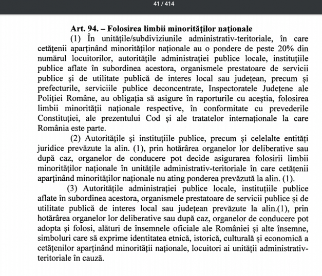Proiectul, asumat de toţi parlamentarii UDMR, care vizează modificarea Codului Administrativ, a fost înregistrat la Senat în toamna anului trecut. Articolul 94 al proiectului legislativ este dedicat folosirii limbii minorităţilor naţionale, se arată în documentul oficial dezvăluit în exclusivitate de Adevărul.