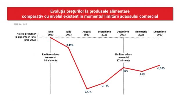 Conform datelor INS, media statistică a prețurilor de consum pentru produsele alimentare a scăzut semnificativ după adoptarea măsurii limitării adaosului comercial, atingând vârful cel mai scăzut în luna august 2023. Chiar dacă ulterior au mai existat variații ale prețurilor la alimente, până la finalul anului trecut media agregată a acestora nu a mai depășit nivelul existent înainte de adoptarea măsurii (luna iunie 2023).