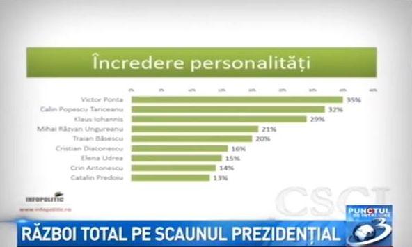 Astfel, din sinteză se vede evoluţia candidaţilor implicaţi în cursa prezidenţială. La nivel de încredere în personalităţi, Victor Ponta conduce detaşat cu 35%, în timp ce contracandidatul său, Klaus Iohannis atinge doar 29%.