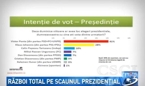 Dacă săptămâna viitoare ar avea loc primul tur al alegerilor prezidenţiale, tot Victor Ponta s-ar bucura de majoritatea sufragiilor, cu 41%, în timp ce Klaus Iohannis ar câştiga doar 28% dintre voturi.