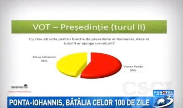 În fine, dacă cei doi ar ajunge finalişti în cursa pentru Cotroceni, Victor Ponta s-ar bucura, conform sintezei, de 55% dintre voturi, în timp ce Iohannis ar aduna 45% dintre voturi.