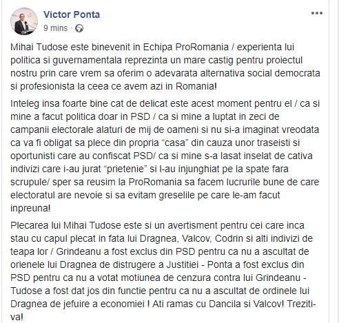 Inteleg insa foarte bine cat de delicat este acest moment pentru el / ca si mine a facut politica doar in PSD / ca si mine a luptat in zeci de campanii electorale alaturi de mij de oameni si nu si-a imaginat vreodata ca va fi obligat sa plece din propria “casa” din cauza unor traseisti si oportunisti care au confiscat PSD/ ca si mine s-a lasat inselat de cativa indivizi care i-au jurat “prietenie” si l-au injunghiat pe la spate fara scrupule/ sper sa reusim la ProRomania sa facem lucrurile bune de care electoratul are nevoie si sa evitam greselile pe care le-am facut impreuna!", a scris Victor Ponta.