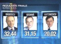 Traian Băsescu a obţinut 32,44% din voturile valabil exprimate, iar Mircea Geoană, candidatul Alianţei PSD+PC, a obţinut 31,15%, conform rezultatelor finale.
