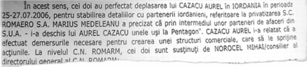 "Cazacu a fost contactat de Marius Medeleanu care i-a solicitat ca oportunităţile de afaceri pe relaţia Iordania să fie întârziate deoarece nu a finalizat operaţiunile de înfiinţare a unei societăţi comerciale prin care Aurel Cazacu urma să încaseze comisioanele cuvenite în urma finalizării unor afaceri pe relaţia Iordania?. (Fragment din Raportul DSM publicat de Evenimentul Zilei.)