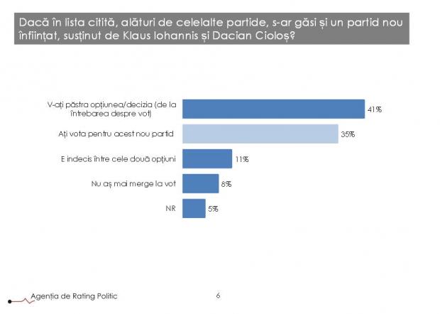 " Un partid nou, susținut de Klaus Iohannis și Dacian Cioloș, ar fi receptat pozitiv și ar aduna adepți de la toate partidele și dintre nehotărâți", spun autorii sondajului.