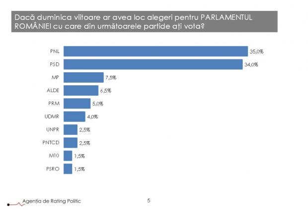 "Sondajul, la 1 an de la alegerile prezidențiale și cu 6 luni înainte de alegerile locale, indică o reașezare pe coordonate noi a pieței politice: Spectrul politic se diversifică din nou, după o perioadă de polarizare care a fost specifică alegerilor prezidențiale. Se confirmă prognoza din aprilie a Agenției de Rating Politic: mergem către un Parlament cu mai mult de 2 partide, pe fondul logicii proporționale a sistemului electoral. Partidele mari, PSD și PNL, revin în "matca" obișnuită pentru partidele lider, cu scoruri în plaja 30-37%. PNL conduce cu 35% din opțiuni, urmat foarte aproape de PSD cu 34%. Noul discurs, în ton mai radical, al lui Traian Băsescu tractează MP într-o zonă de relevanță, pe locul 3, cu 7,5%. ALDE, condus de președintele Senatului, Călin Popescu Tăriceanu, și rezultat din fuziunea PLR și PC, se plasează de asemenea peste pragul electoral, la 6,5%", se arată în concluziile cercetării.