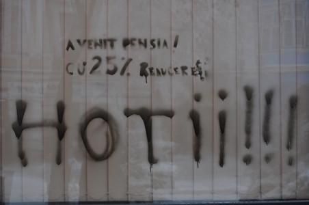 Protestatarii au scris pe geamurile sediului PDL, cu vopsea neagră şi portocalie, mesajele "A venit pensia cu 25% reducere!", "Hoţii!", "Jos PDL!" şi "Trăiţi bine?".
