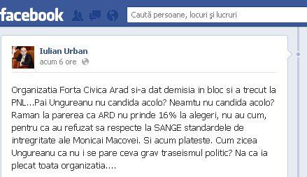 "Organizaţia Forţa Civică Arad şi-a dat demisia în bloc şi a trecut la PNL... Păi Ungureanu nu candida acolo? Neamţu nu candida acolo? Rămân la părerea că ARD nu prinde 16% la alegeri, nu au cum, pentru că au refuzat să respecte la sânge standardele de intregritate ale Monicăi Macovei. Şi acum plăteşte. Cum zicea Ungureanu că nu i se pare ceva grav traseismul politic? Na, că ia plecat toata organizaţia...", scrie Iulian Urban, pe reţeaua de socializare.