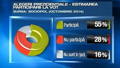 De asemenea, sondajul SOCIOPOL a măsurat numărul celor care se declară interesaţi de participarea la vot. 55% anunţă că vor participa, 28% că nu participă.