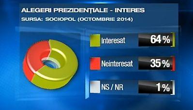 Potrivit sondajului, subiectul alegerilor prezidenţiale se bucură de un interes major. 64% dintre românii chestionaţi se declară interesaţi de alegerile prezidenţiale.