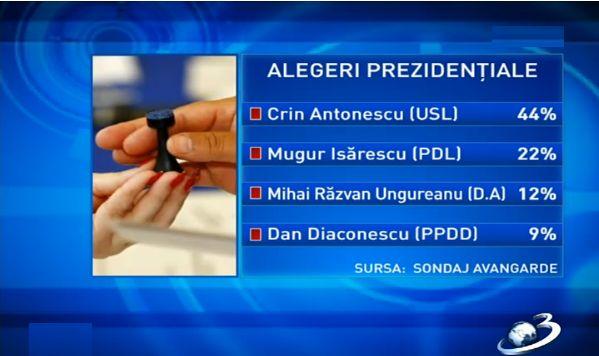 Astfel, pentru candidatul la fotoliul prezidenţial, românii au votat 44% cu Crin Antonescu (candidatul USL), 22% cu Mugur Isărescu (candidat PDL), 12% cu Mihai-Răzvan Ungureanu (candidat al Alianţei D.A.), 9% cu Dan Diaconescu (candidat PP-DD), 8% cu C. V. Tudor (candidat PRM) şi 5% cu Hunor Kelemen (candidat UDMR).
