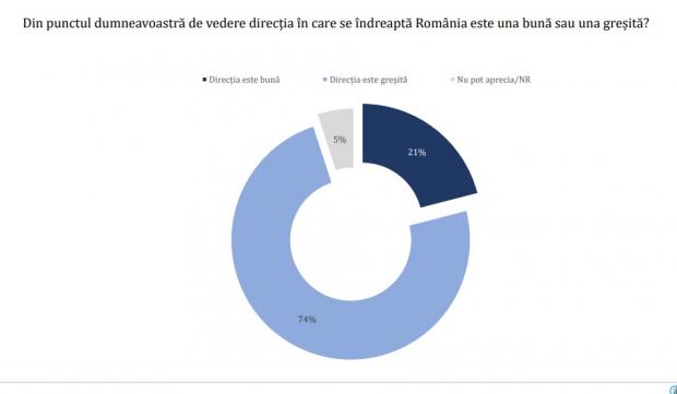 Întrebați în ce direcție se îndreaptă România, 74% dintre respondenți au spus că țara merge într-o direcție greșită. Doar 21% cred că lucrurile merg bine, iar 5% nu au putut răspunde.