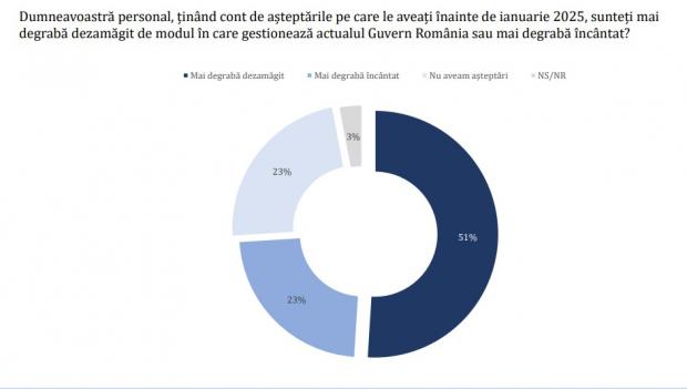 La capitolul încredere în actualul Guvern, 51% dintre cei chestionați au declarat că sunt mai degrabă dezamăgiți de felul în care este gestionată țara, în timp ce doar 23% s-au declarat mulțumiți.