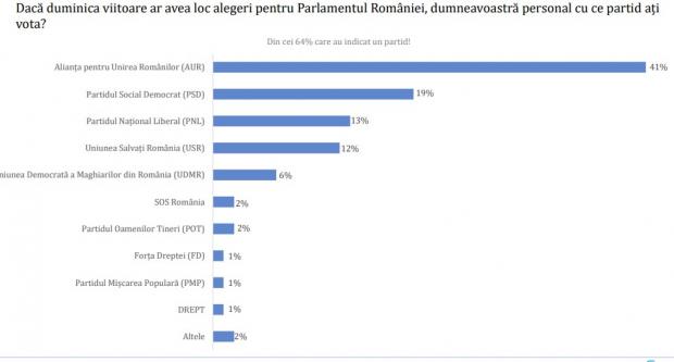 În privința intențiilor de vot, AUR este pe primul loc cu 41%, urmat de PSD – 19% și PNL – 13%. USR ar obține 12%, UDMR – 6%, iar SOS România și Partidul Oamenilor Tineri câte 2%.